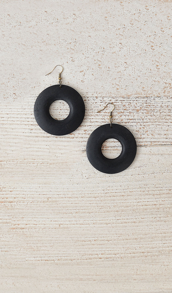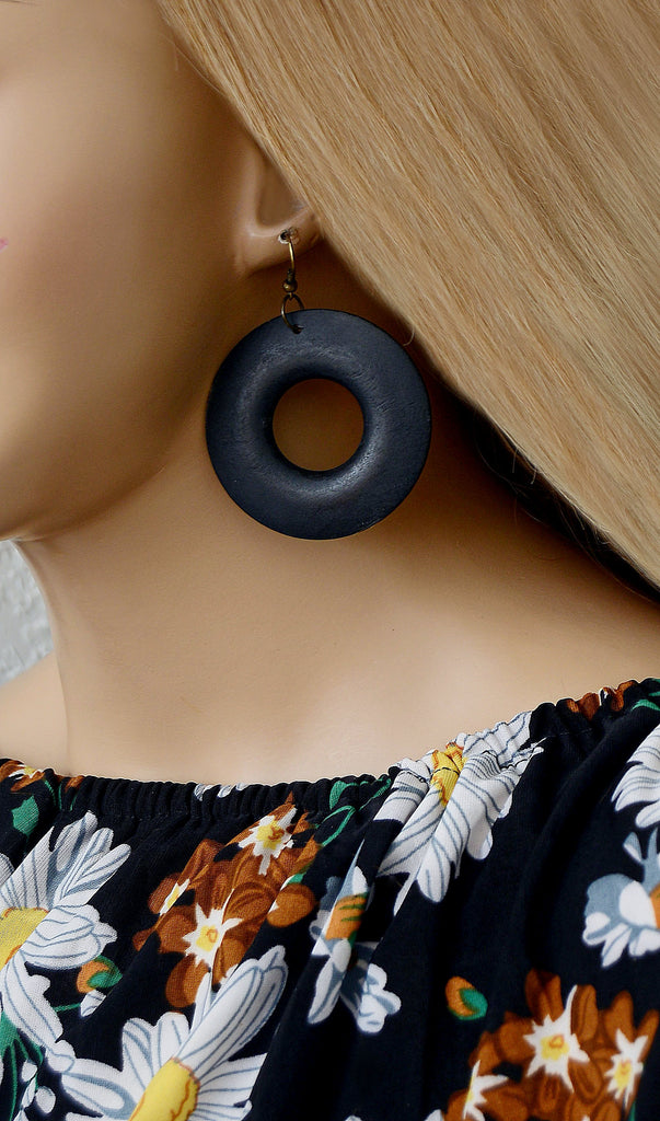 Style# BlackE-002-CSB Showing is a pair of cute black wooden hoop earrings with a cutout design that's very simple. Earrings do not seem heavy nor, do they seem to pull, but for some people, they might.