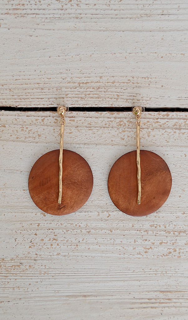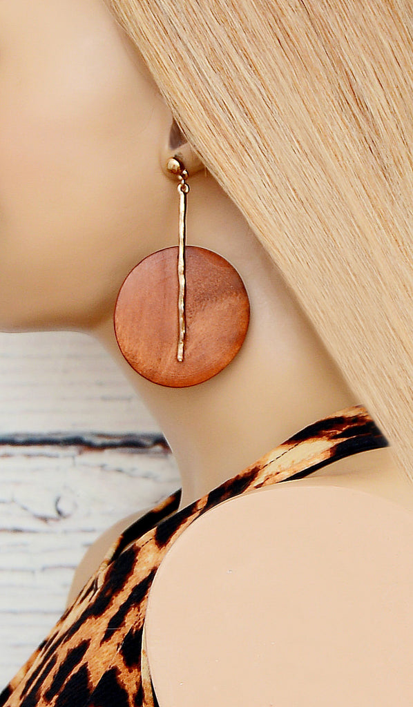 Style# Cognac BrownE-001 These wooden earrings will go great with just about any outfit you wear. The cognac rust and gold are such a nice mixer. Earrings do not seem heavy nor do they seem to pull, but for some people, they might.