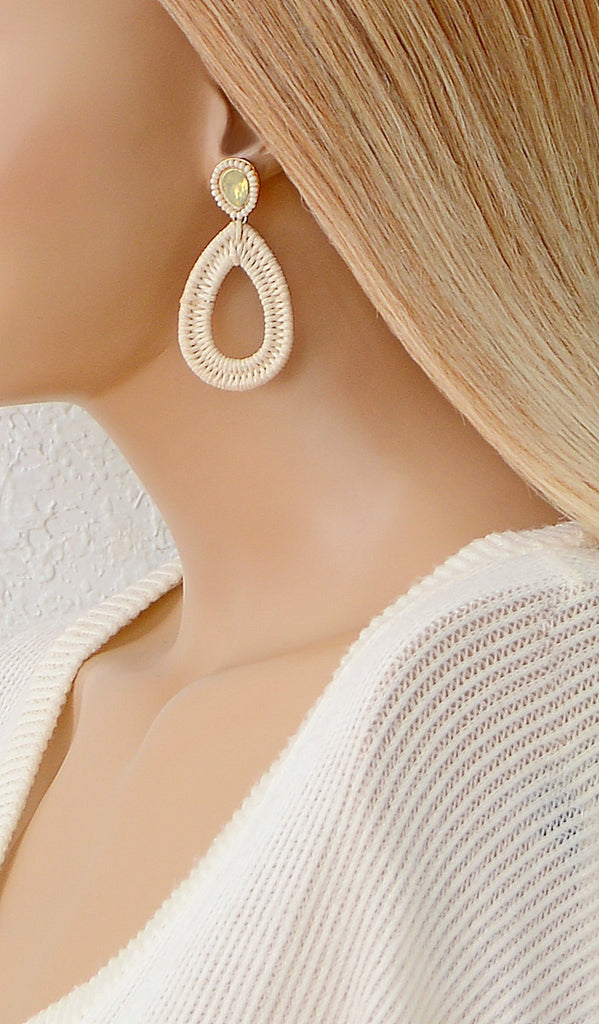 Style# IvoryE-001 As you can see these wicker teardrop earrings are simple and classy, that can be styled with just about any outfit. The inserted stones adds a expensive look to the earrings.